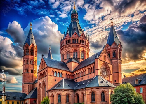 © Sirinporn, Obraz premium Majestic Mainz Cathedral: Gothic Architecture & Spire Detail, Germany