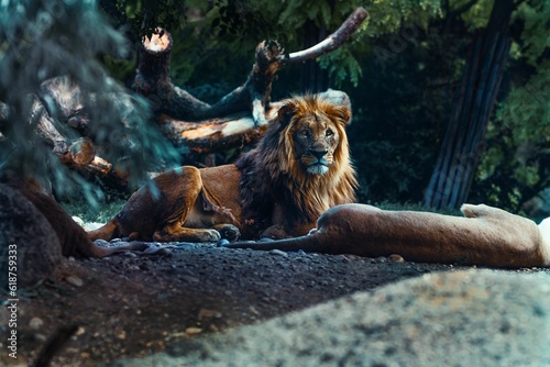 © Thomas Kilcher/Wirestock Creators, Naklejka premium Majestic male lion at the edge of a tree trunk in a zoo setting