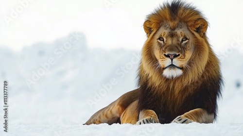 Naklejka premium Majestic Male Lion in Snowy Landscape Winter Wildlife