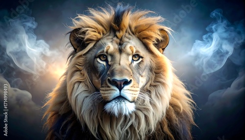 Naklejka premium Majestic Male Lion Portrait: Golden Mane, Smoky Background
