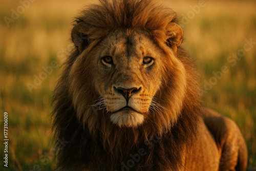 © Bijac, Obraz premium Majestic male lion resting on sunlit savanna with golden mane and piercing gaze