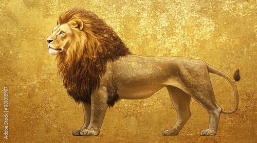 © NpicArt, Obraz premium Majestic Male Lion Standing Against Gold Background