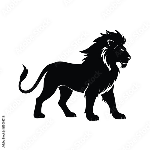 © Crazy Dreamy Boy, Fototapeta premium Majestic male lion walking in profile black silhouette graphic design element