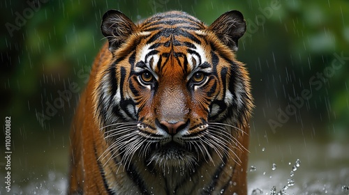 Naklejka premium Majestic male tiger emerging from rain-soaked forest highlighting its fierce...