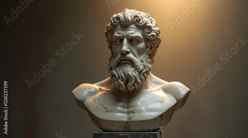 Fototapeta premium Majestic marble bust of Jupiter, the supreme Roman god of thunder and sky. His powerful expression, flowing beard, and classical craftsmanship embody divine authority and strength.