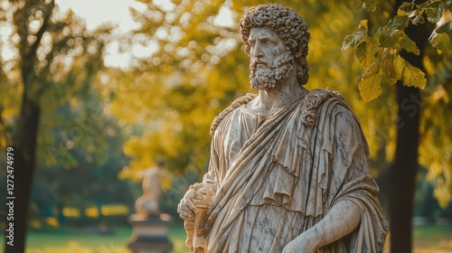 © Kitta Studio, Fototapeta premium Majestic Marble Sculpture of Greek God in Sunlit Park Setting