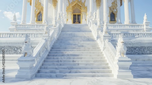 © Jakkarin, Obraz premium Majestic Marble Staircase with Guardian Carvings in Thai Temple - Cinematic Architectural Grandeur