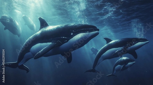 © Barokahe, Obraz premium Majestic marine orcas cruising through blue waters under the ocean surface