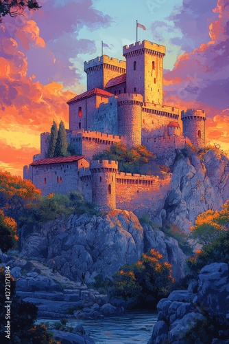 © aicandy, Fototapeta premium Majestic Medieval Castle Perched on Rocky Hill at Sunset with Dramatic Sky and Vibrant Foliage Surrounding the Stone Structure