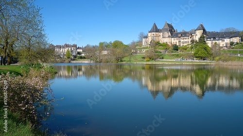 Fototapeta premium Majestic medieval castle reflected in serene waters of a tranquil lakeside park in spring