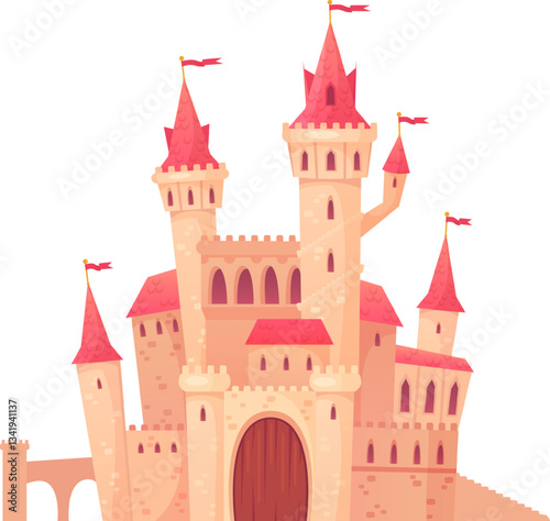 Fototapeta premium Majestic medieval castle with pink roof, towers, flags and wooden gate, isolated on white background, perfect for fairytale illustrations, children s books or fantasy games