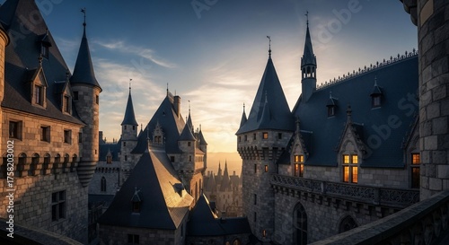 © MUHAMMADADIALFARIS, Fototapeta premium Majestic medieval castle with towering spires against a dramatic sunset sky.