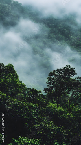 Obraz premium Majestic Misty Forest Canopy in Lush Verdant Landscape : Generative AI