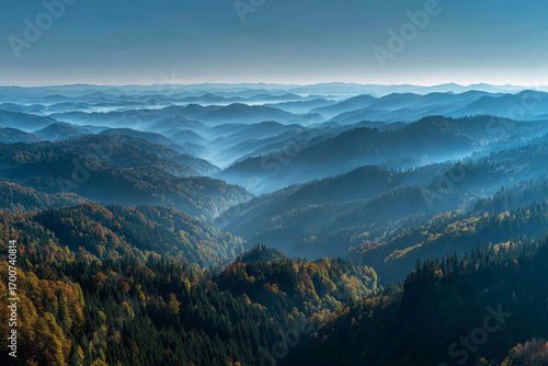 © Abir, Fototapeta premium Majestic misty mountains autumnal forest scenic view vast landscape