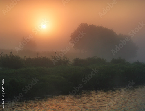 © Bashkatov, Fototapeta premium Majestic misty sunrise above the Teterev river