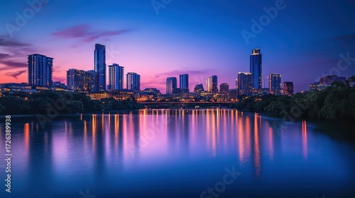 © Sarawut, Fototapeta premium Majestic Modern Skyline: High-angle View of Skyscrapers at Sunset, Reflected in the Water, Emphasizing Urban Growth and Architecture.
