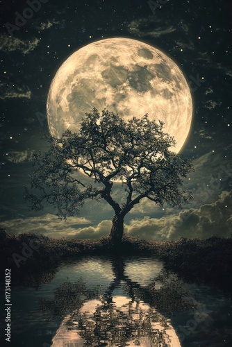 © jodoto, Fototapeta premium Majestic Moonrise Behind Silhouetted Tree and Reflective Waters