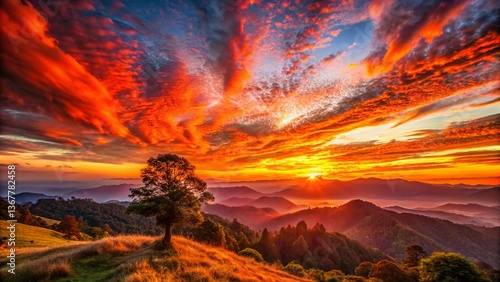 © Sirinporn, Naklejka premium Majestic Morgenrot Sunrise Over Serene Landscape