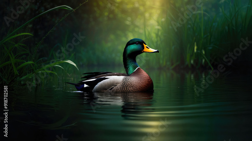 © Yolhan, Fototapeta premium Majestic Morning: A Duck's Serene Swim in the Sunlit Pond