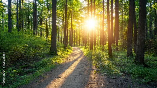 Fototapeta premium Majestic Morning Sunlight Shines Through the Tranquil Green Forest Hiking...