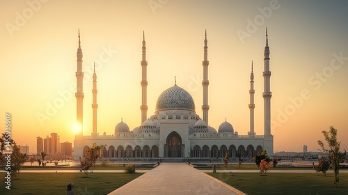 Naklejka premium Majestic mosque at sunrise, featuring a grand, white, modern architectural...