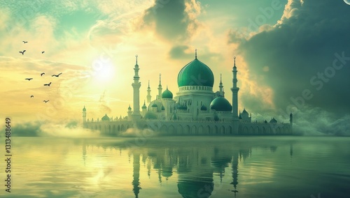 © Musa, Fototapeta premium Majestic mosque floating on a misty lake at sunrise