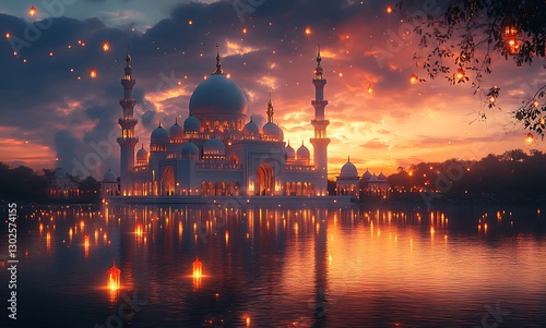 © Asif, Fototapeta premium Majestic Mosque Illuminated at Dusk, Reflecting in Water with Glowing Lanterns and Vibrant Sunset Sky