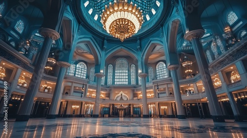 Obraz premium Majestic Mosque Interior, Dome, Columns, Lighting, Marble Floor, Prayer Hall,...