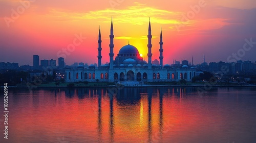 © Zaenal, Naklejka premium Majestic mosque reflected in calm water at sunset.