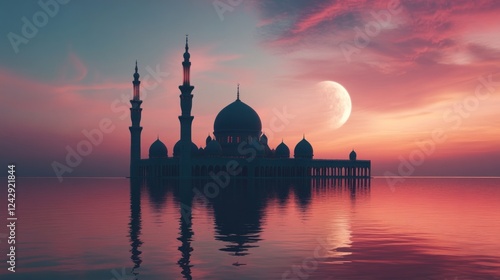 Fototapeta premium Majestic Mosque Silhouette at Sunset Over Calm Waters