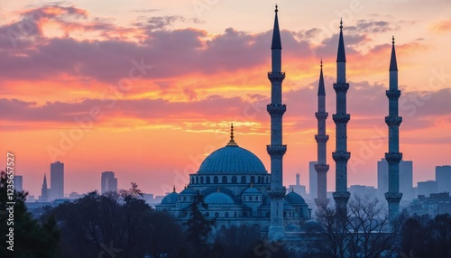 © Staaarscream, Obraz premium Majestic Mosque Silhouette at Sunset over City Skyline