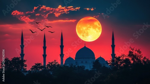 © liklik, Fototapeta premium Majestic Mosque Silhouette at Sunset with Blood Moon