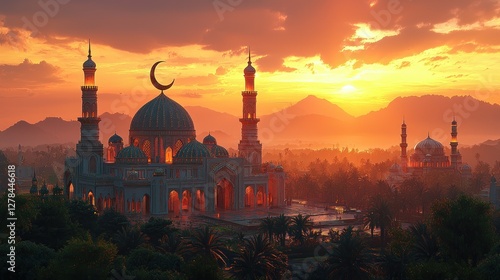 © Matteo_std, Naklejka premium Majestic mosque silhouette at sunset with vibrant sky and tranquil landscape
