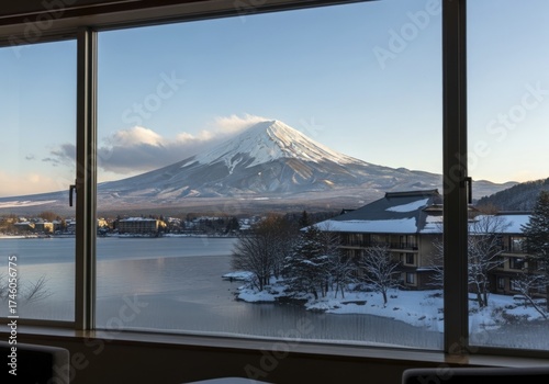 Obraz premium Majestic Mount Fuji and Serene Lake Kawaguchiko in Winter, Viewed from a Hotel Window