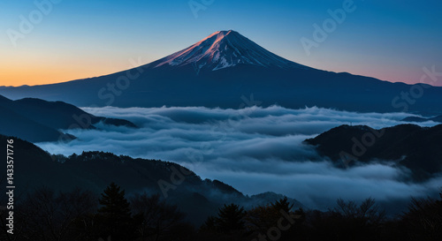 © farazspawn, Fototapeta premium Majestic Mount Fuji at Sunrise Above a Sea of Clouds – Iconic Japanese Landscape with Silhouetted Trees