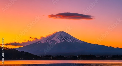 © geny, Fototapeta premium Majestic mount fuji at sunset with vibrant orange and purple sky