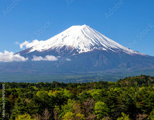 © Bayu, Fototapeta premium Majestic Mount Fuji Under Clear Blue Sky, Lush Green Forest Below.