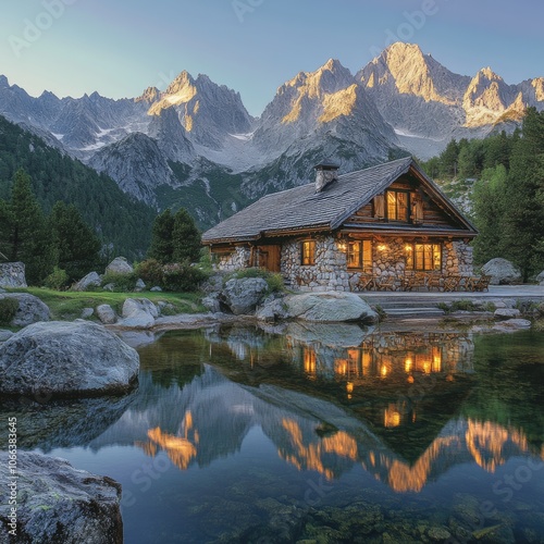 Naklejka premium Majestic Mountain Cabin Reflection Peaceful Lakeside Retreat