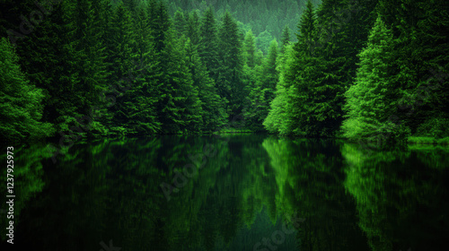 Obraz premium Majestic mountain forest reflecting on tranquil lake under serene green canopy