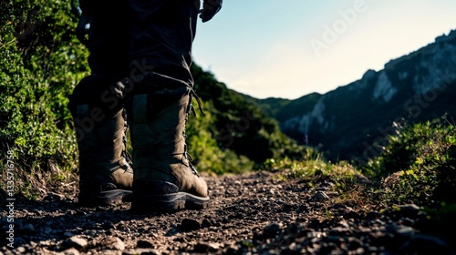 © Narongsag, Naklejka premium Majestic Mountain Hike Close up of Hiking Boots on Trail
