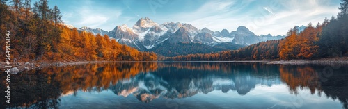 Fototapeta premium Majestic Mountain Lake with Autumn Forest and Clear Reflection