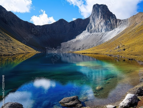© Rapit, Fototapeta premium Majestic Mountain Lake with crystal clear water reflecting blue skies and clouds