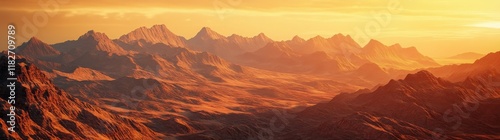 Naklejka premium Majestic mountain landscape bathed in golden sunlight at dusk, highlighting rugged terrain and distant peaks under a serene sky