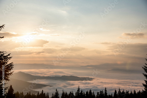 © Almanah P., Fototapeta premium Majestic Mountain Landscape Covered in Mist with Sun Rays Breaking Through Clouds
