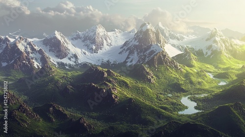 © aleks, Fototapeta premium Majestic mountain landscape showcasing rugged peaks and lush valleys during golden hour light