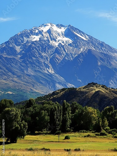 Naklejka premium Majestic Mountain Landscape Under Bright Blue Sky Showcasing Nature In All...
