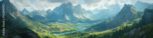 Fototapeta premium Majestic Mountain Landscape With a Winding River and Lush Greenery Under a...