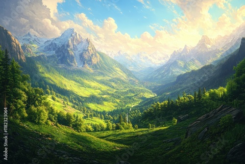 Fototapeta premium Majestic mountain landscape with bright sunlight illuminating lush greenery in a serene valley