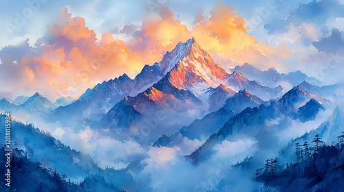 © ggamyuii, Obraz premium Majestic Mountain Landscape with Cloudy Skies and Vibrant Sunset Colors