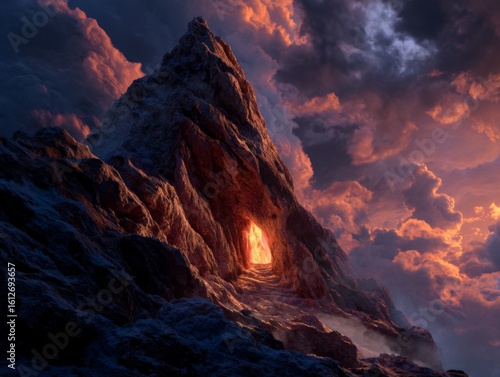 Fototapeta premium Majestic Mountain Landscape with Dramatic Clouds and Glowing Cave Entrance...